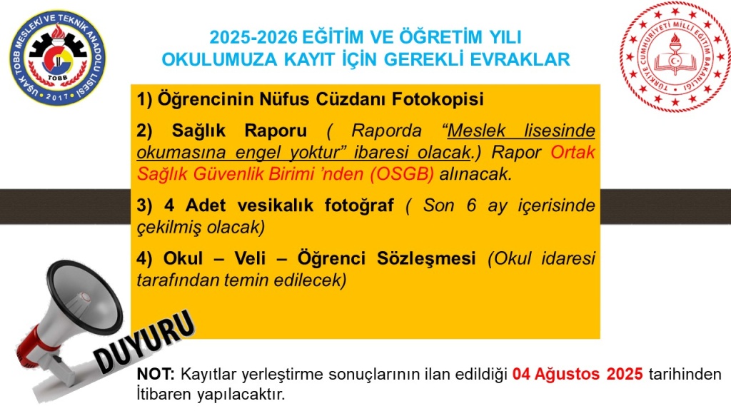 Okulumuza Kayıt İçin Gerekli Evraklar